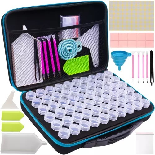 - MNÓSTWO ELEMENTÓW W ZESTAWIE – w zestawie do haftu diamentowego znajduje się mnóstwo elementów, dzięki którym wyklejanie obrazków diamentowych stanie się o wiele wygodniejsze oraz praktyczne. Zestaw obejmuje akcesoria takie jak: etui, 60 słoiczków, 10 kwadratów kleju, 3 kuwety o różnych rozmiarach, silikonowy składany lejek, 4 długopisy o różnych rozmiarach, pęseta, woreczki strunowe, 1 szpatułka do wyrównywania ułożonych linii.