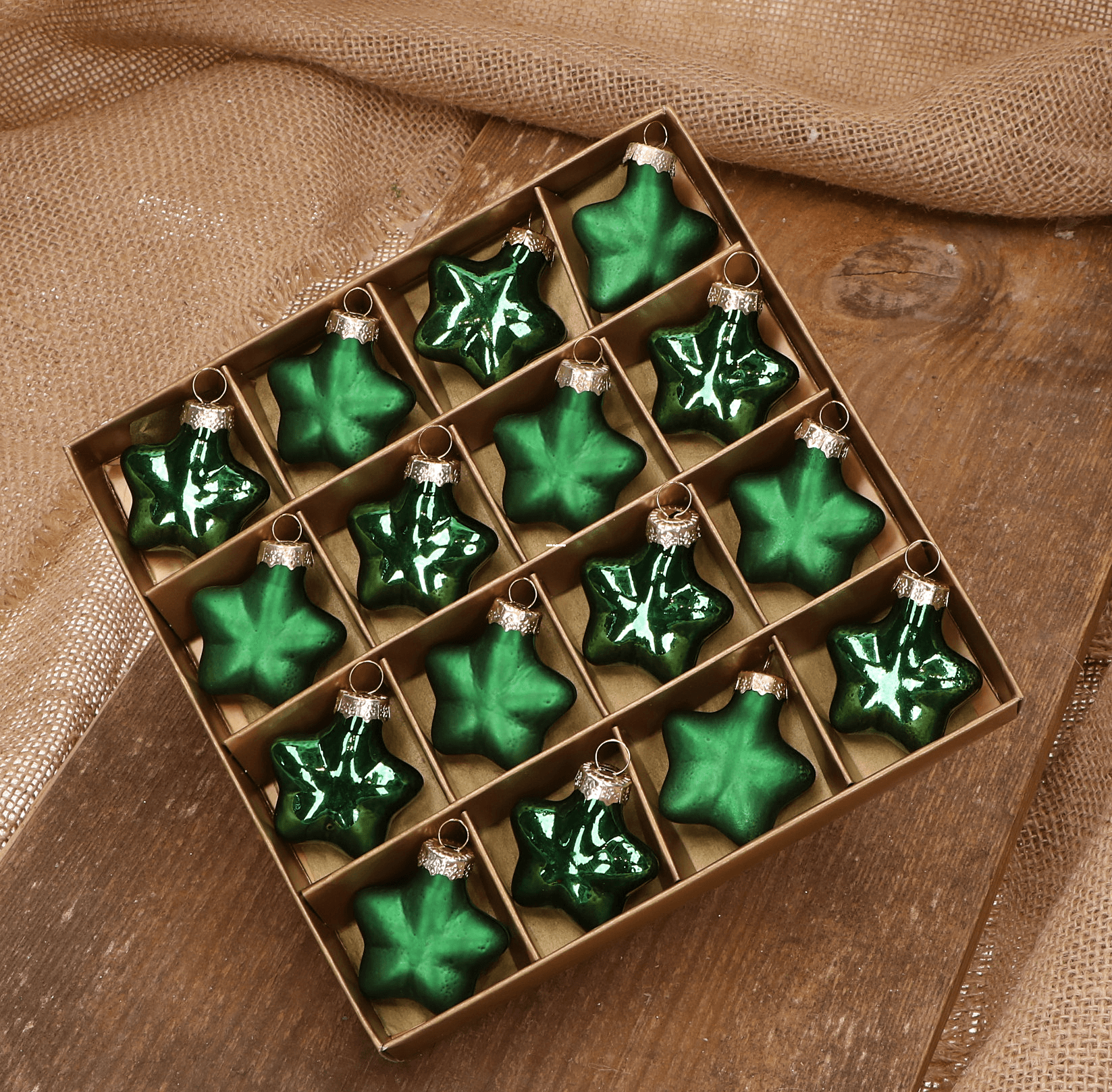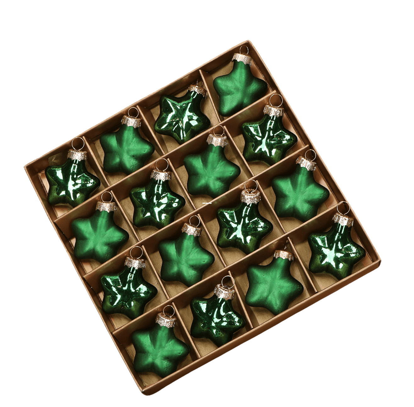 Piękne, szklane gwiazdki w zielonym kolorze to doskonały wybór do ozdobienia Twojej choinki. Zestaw zawiera 16 sztuk gwiazdek o różnorodnym wykończeniu - matowym i błyszczącym, co dodaje dekoracji niepowtarzalnego uroku i elegancji. Wykonane z wysokiej jakości szkła, są trwałe i odporne na uszkodzenia. Gwiazdki są zapakowane w złote opakowanie, co czyni je idealnym pomysłem na prezent. Zielony kolor, kojarzący się z naturą i spokojem, pięknie komponuje się z innymi świątecznymi dekoracjami, dodając ciepła i radości do każdej aranżacji.