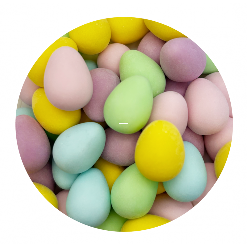 Ich cukrowe skorupki w delikatnych pastelowych odcieniach przypominają malowane akwarelami malutkie pisanki. Te miniaturowe jajeczka, w rozmiarze idealnym na jeden kęs, to świetny wybór do ozdobienia wielkanocnych smakołyków.