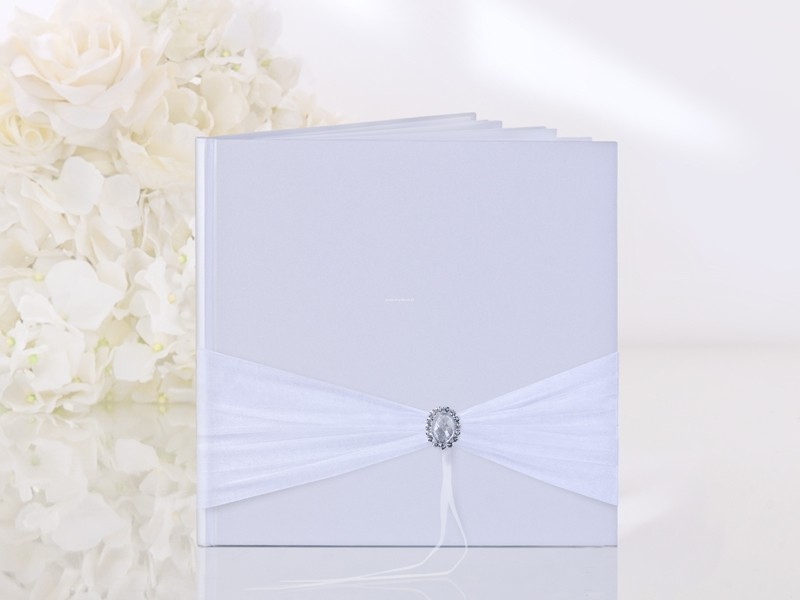Księga Gości oprawiona perłowym papierem w kolorze białym, z białą organzą i srebrną aplikacją.