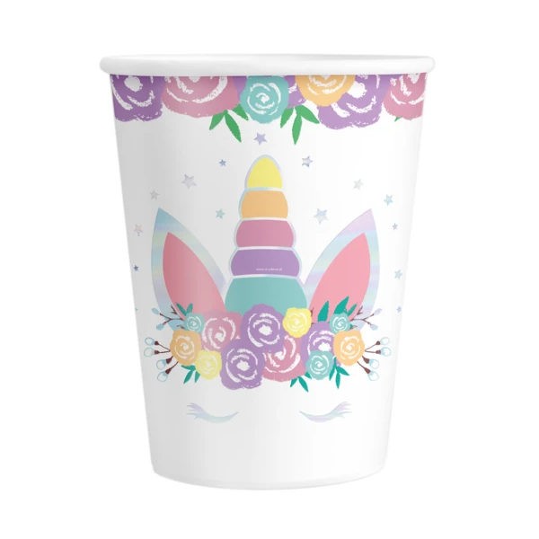 Papierowe kolorowe kubeczki z motywem jednorożca. Świetnie sprawdzą się na przyjęcie urodzinowe Twojego dziecka!