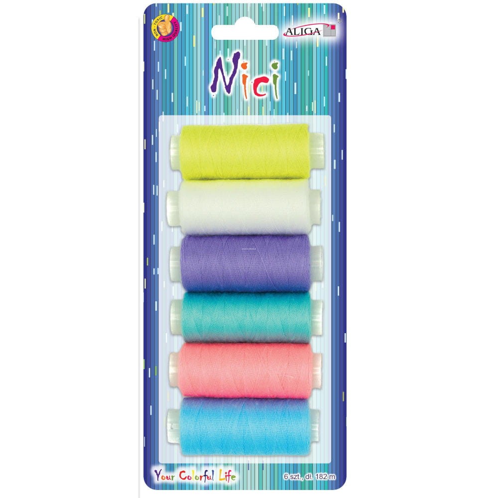 Zestaw 6 szpulek różnokolorowych nici poliestrowych o długości 182 m każda.