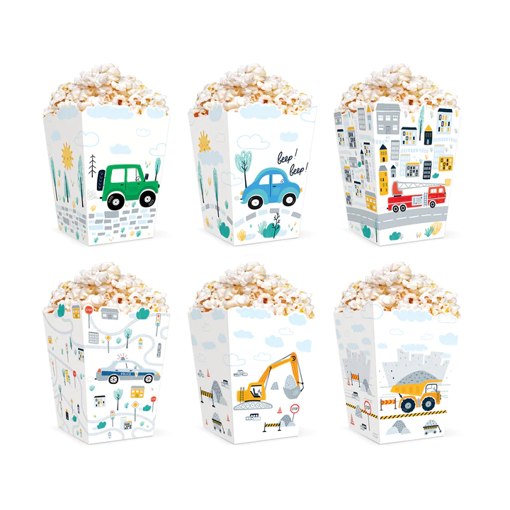 Pudełka na popcorn z kolekcji Auta to 6 różnych historii opowiedzianych za pomocą wspaniałych rysunków, które pobudzą wyobraźnię każdego dziecka.