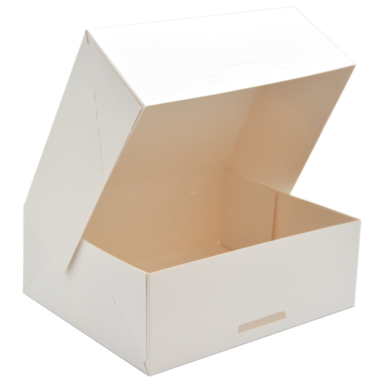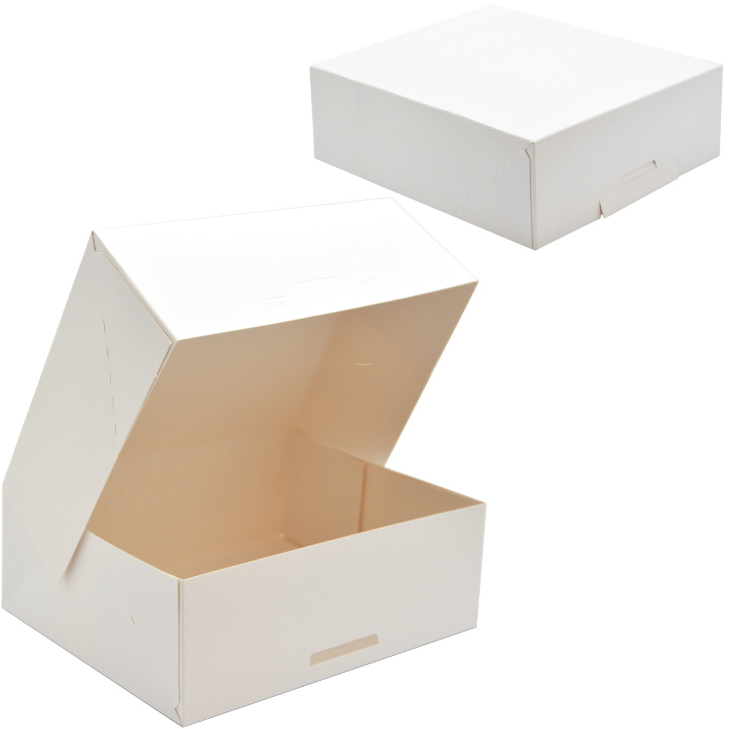 Białe pudełko na ciasto, tort, muffinki, ciastka itp. Produkt w formie pojedynczego arkuszu składające się na całe opakowanie (dno oraz wieczko). Produkt do samodzielnego złożenia.