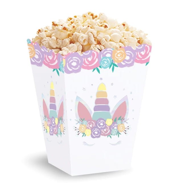 Zestaw 6 pudełek na popcorn wykonanych z papieru z nadrukiem w kolorowego jednorożca. Idealne na różne imprezy oraz przyjęcia.