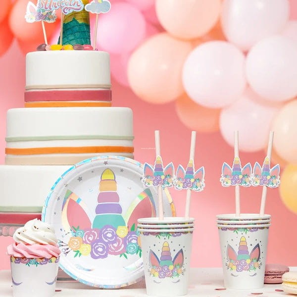 Zestaw 6 talerzyków wykonanych z papieru w pięknych kolorach z motywem jednorożca. Przeznaczone do zimnych i ciepłych potraw.